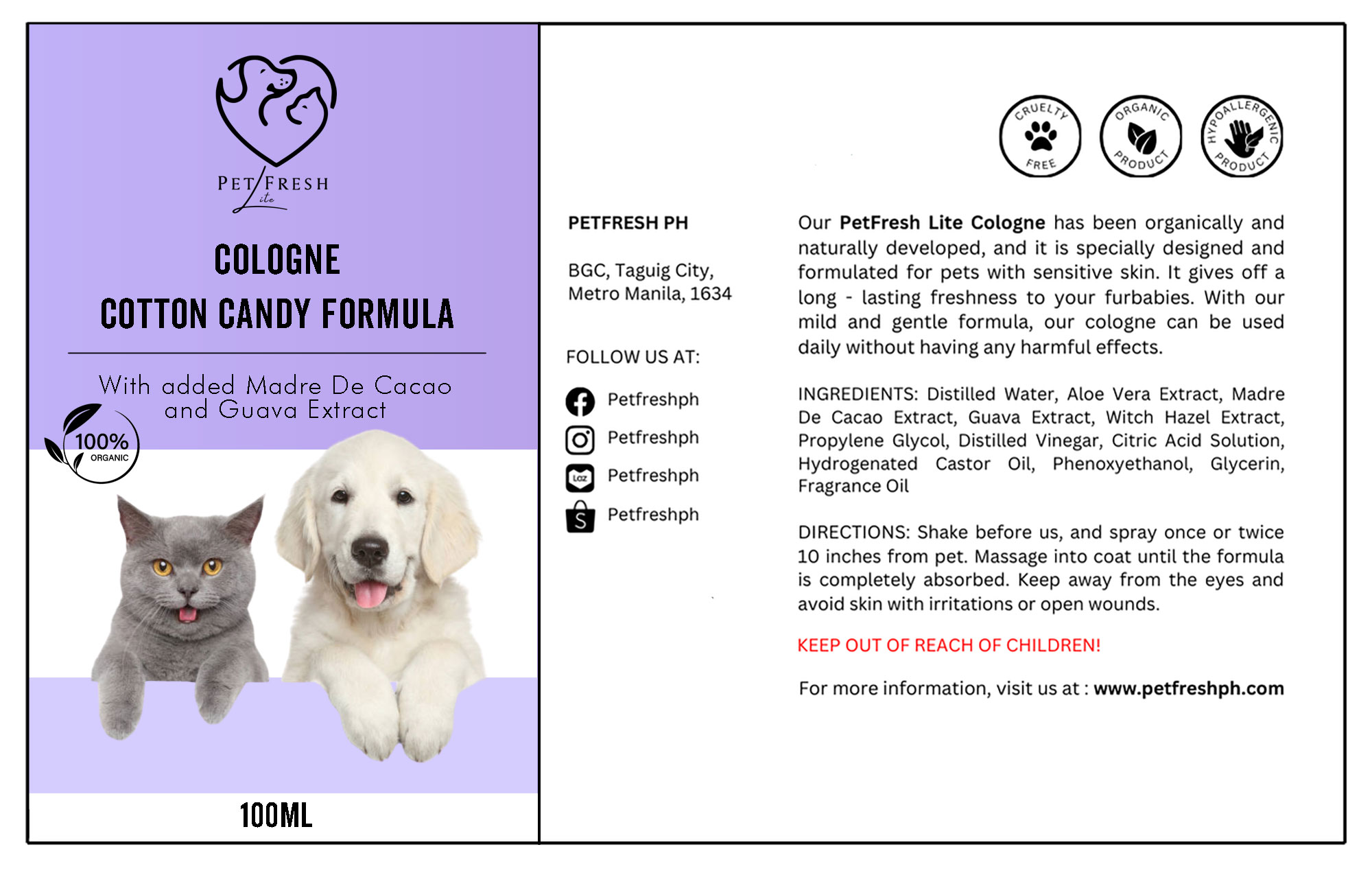 We source 100% organic ingredients locally from the Philippines’ rich natural landscape, including soothing coconut oil, calming aloe vera, healing madre de cacao, and antioxidant-rich guava extract. These hypoallergenic, chemical-free formulas nourish and protect, with madre de cacao easing skin irritations and guava extract promoting a shiny coat. By choosing local ingredients, Petfresh supports Filipino farmers and sustainable practices, ensuring an eco-friendly approach that benefits both pets and the planet.